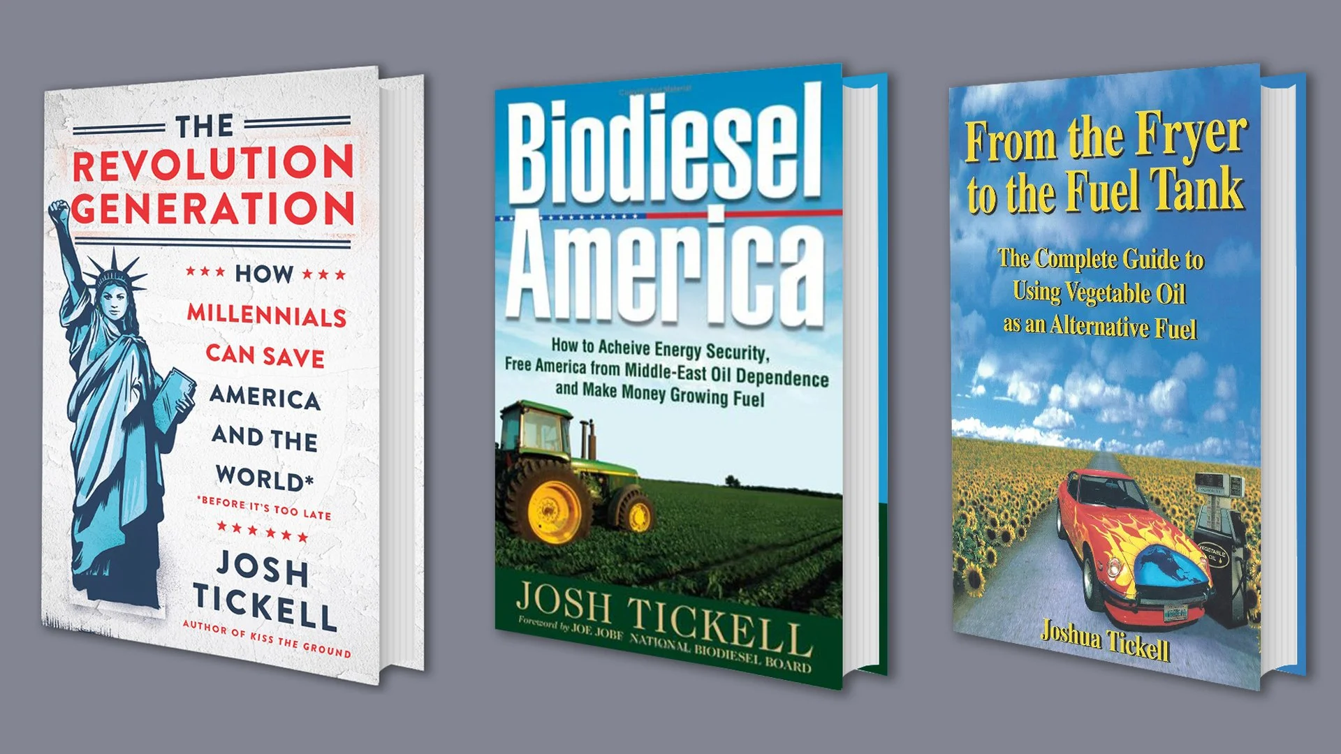 Author & Storyteller Josh Tickell began with his book From the Fryer to the Fuel Tank, then he wrote Biodiesel America, Kiss the Ground, and most recently The Revolution Generation as his published works.